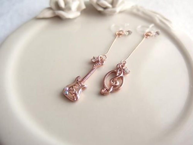 薔薇とギターのラインストーンピアス