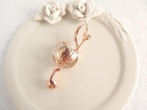 中央に配置された大きなクリスタル(人工宝石)が印象的な、ト音記号モチーフのブローチです。