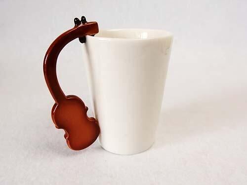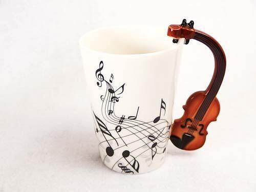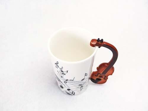 楽譜柄に、持ち手部分がバイオリンという非常に珍しいデザインのマグカップです。